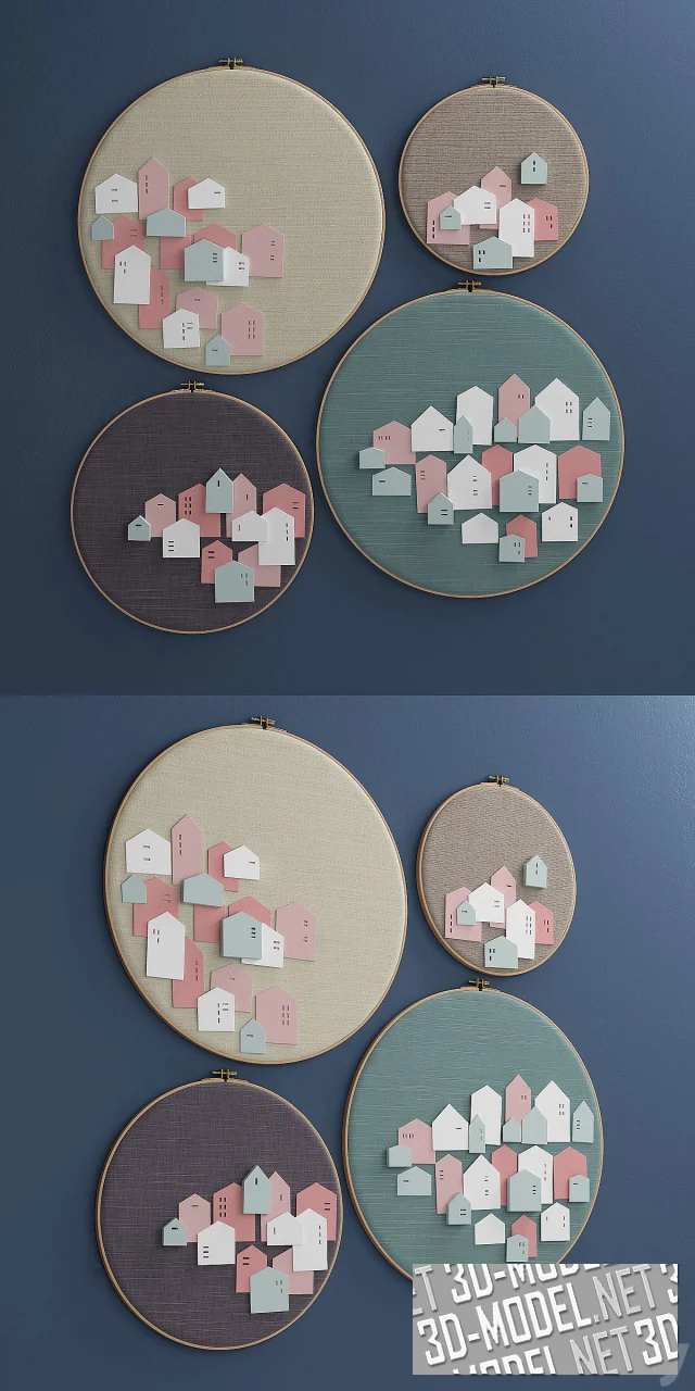 Настенный современный декор в скандинавском минималистичном стиле для детской комнаты. Панно выполнено на базе четырех пяльцев нескольких диаметров. На пяльца натянута ткань приятных пастельных оттенков (слоновая кость, бледное какао, темно-серый с коричневато-фиолетовым оттенком, бирюзовый). На тканевом фоне закреплены группы минималистичных силуэтов домиков из картона разной толщины. Домики четырех пастельных тонов (белые, бледно-голубые, бледно-розовые, розовые). Скомпонованные в квадрат (большое/малое + малое/большое), пяльца имеют примерный габарит 110х110см.