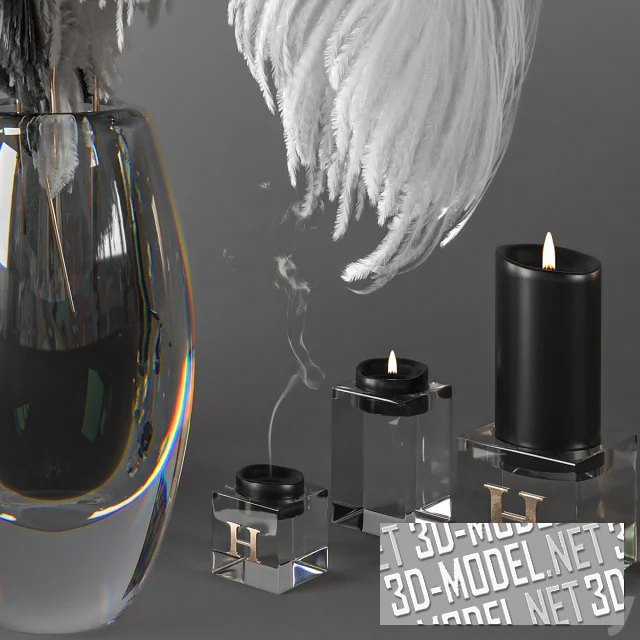 Интересный набор декора для наполнения современного интерьера. Состоит из хрустальной вазы, свечей с подсвечниками, книг, статуэток. Украшают сет страусиные перья. Все эти предметы образуют гармоничную композицию, которая отлично подойдет в качестве праздничного украшения дома, бара, отеля и др.