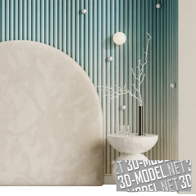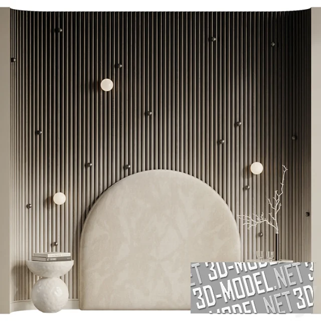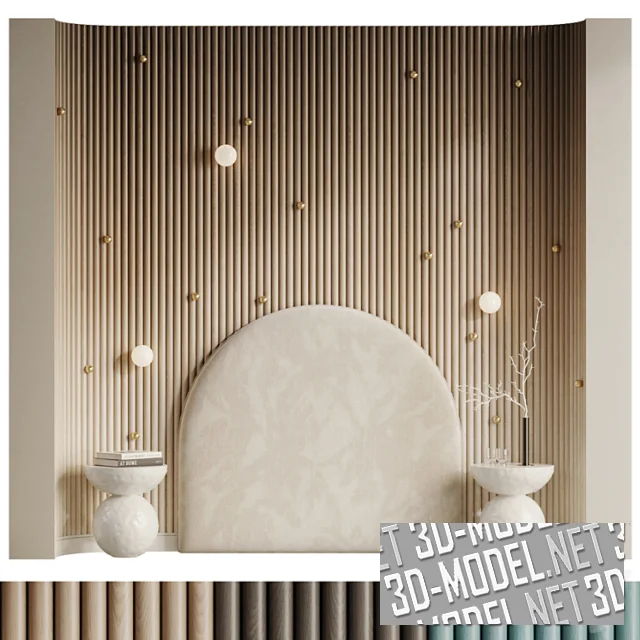 Интересным решением в интерьере спальни станет ниша, набранная из тонированных деревянных реек (представлена в трех вариантах). Поверхность украшена металлическими декоративными бусинами и сферическими бра, напоминающими звезды, что смотрится очень романтично и уютно.