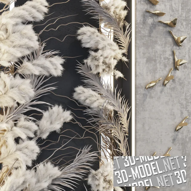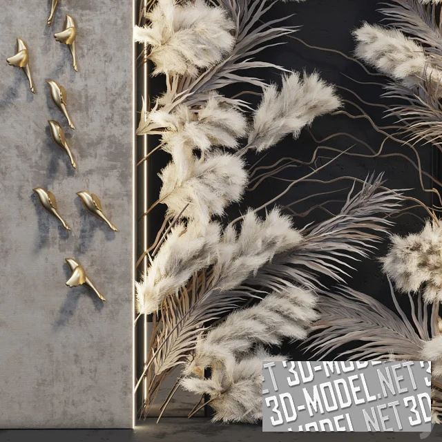 Декоративное панно для украшения интерьера (Wall Decor Bird Collection). Центральная часть декорирована метелками пампасной и другой травы. Боковые элементы отделаны тканью и украшены фигурками летящих птиц. Размер: 3200 x 3000h x 500 мм.