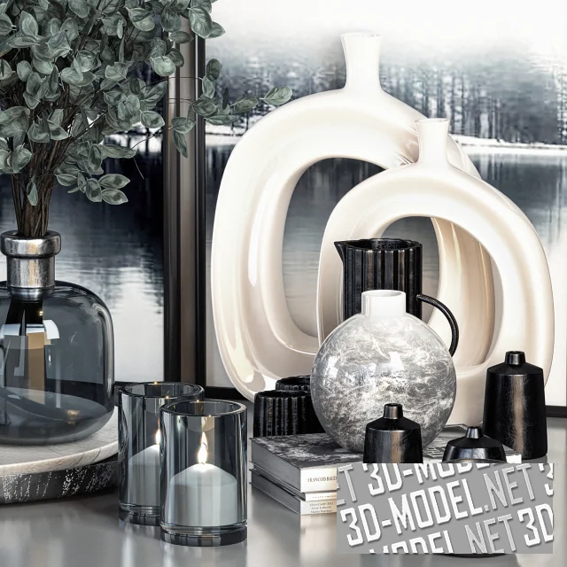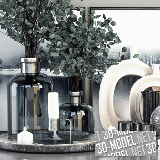 Стильный и выразительный набор интерьерных аксессуаров, в котором преобладает холодный синий оттенок. В центре внимания стеклянные элементы - вазы, подсвечники. Ветки с листьями также имеют схожий цвет, что делает набор строгим и элегантным. Картины, другие вазы и аксессуары гармонично поддерживают стилистику сета.