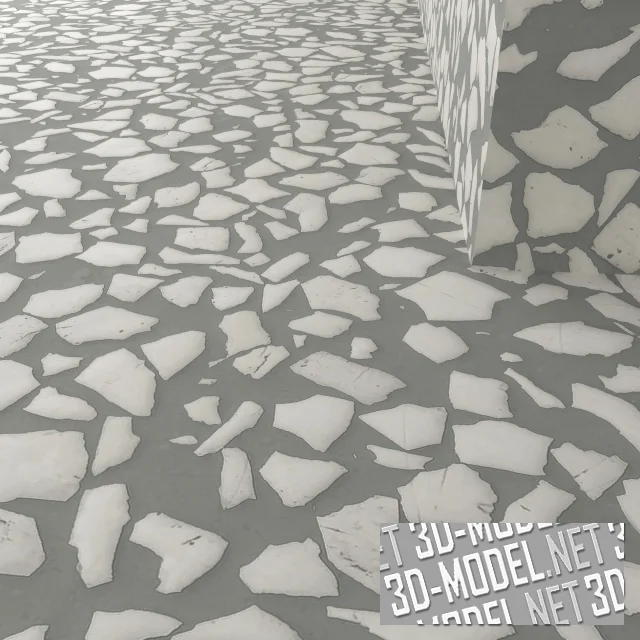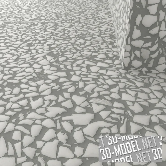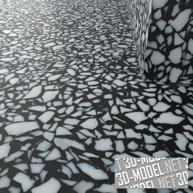 Варианты классической отделки поверхностей стен и пола - Terrazzo, выполненной из кусочков белого мрамора, залитых цементным раствором серого или черного цвета. После застывания поверхность полируется. Представлены четыре варианта материала с разной величиной и формой кусочков мрамора и разной заливкой.