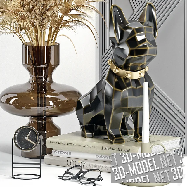 Гармонично собранный набор интерьерного декора. В комплекте книги, настольные часы, ваза с букетом из сухостоя, свеча, рельефное абстрактное панно. Выделяется в сете оригинальная скульптура бульдога.