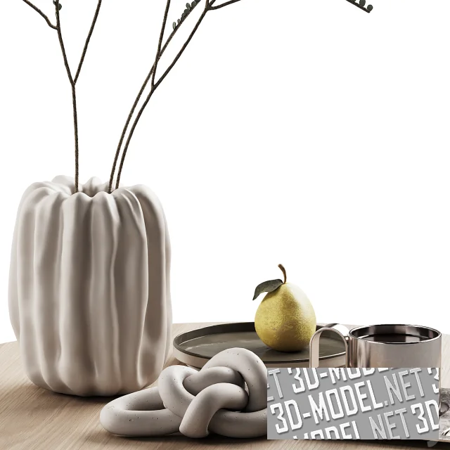 Интерьерный набор настольного декора. На круглой столешнице из светлого дерева размещены белая керамическая толстостенная ваза с вертикальными складками, ветки в вазе, круглый поднос с желтой грушей, настольная скульптура в виде каменного узла, прямоугольный стальной поднос с выемками для стальной ложки и кружки. Габарит композиции 57х80х80см.