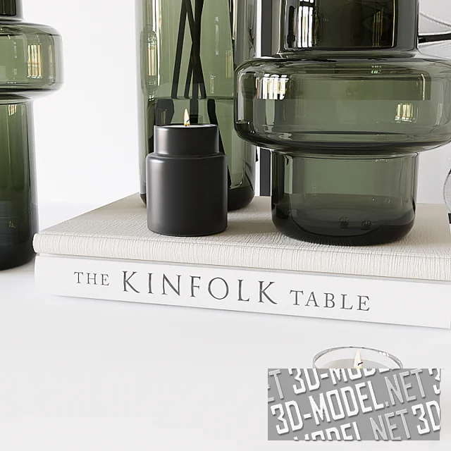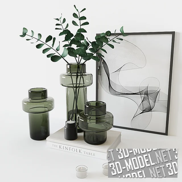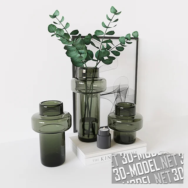 Спокойная декоративная композиция, в комплект которой входят вазы из зеленого стекла (одна из них с ветками эвкалипта), стеклянные подсвечники, книги, фоторамка. Элегантная эстетика и цветовая гамма позволяют использовать набор для украшения любого пространства.