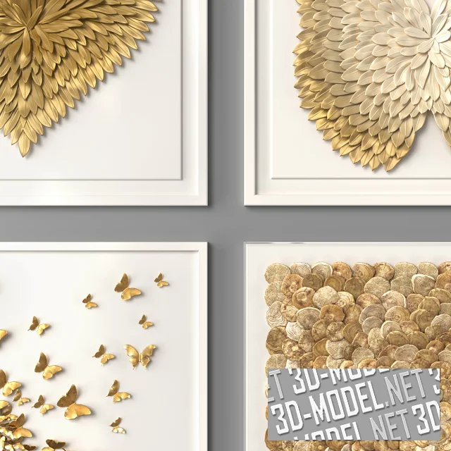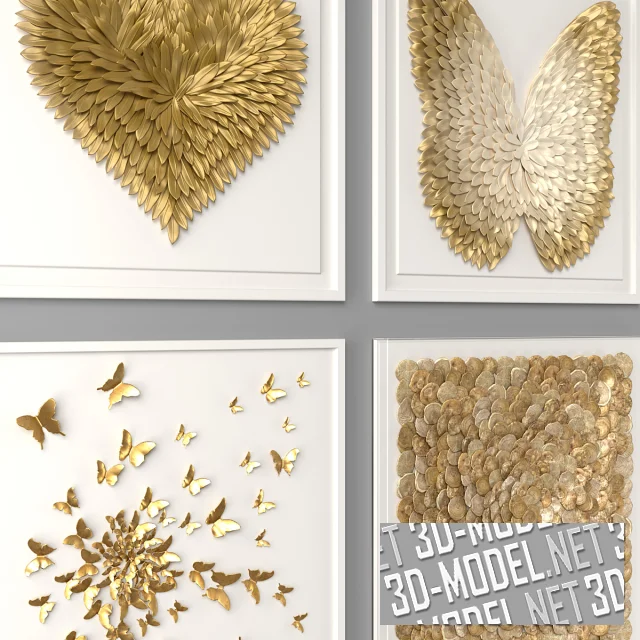 Современные декоративные настенные панно от Restoration Hardware. На четырех квадратных белых панелях в тонких белых рамках (с габаритом: 101,6х101,6х5,1см) смонтированы объемные золотистые элементы, сгруппированные в изображения. Первое панно: HAND-FOLDED PAPER BUTTERFLY SPIRAL ART - изображает стайку мелких золотистых бабочек. Второе: FEATHERED HEART - GOLD, в виде сердца из золотистых перьев. Третье: CAPIZ SHELL ART - GOLD, из множества круглых ракушек золотистых оттенков, набранных чешуйками в форму квадрата. Четвертое панно: OMBRE FEATHER WINGS - GOLD, изображает силуэт крупной бабочки, набранный из золотистых перьев.