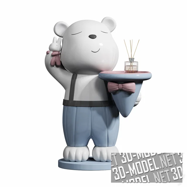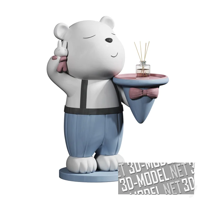 Забавный элемент современного интерьера - медведь со шляпой в левой лапе, приставной столик-подставка. Белый мультяшный медведь в бледно-синих штанах с черными подтяжками стоит на круглой площадке. Блаженно улыбаясь, держит в поднятой лапе фигурку маленького зайца в розовом комбинезоне. Столешницей служит круглая плоскость перевернутой шляпы с бантом. На столике стоит стеклянный флакон аромо-диффузора с палочками.