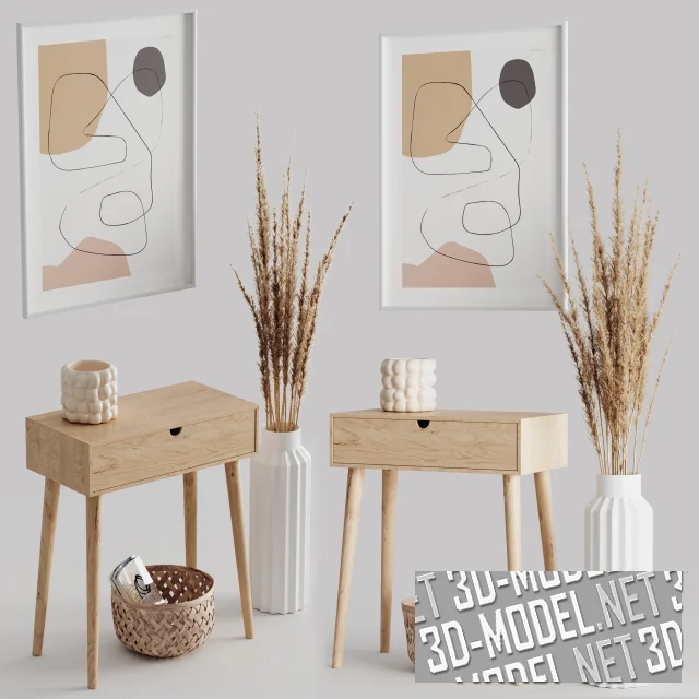 Декоративная интерьерная композиция в светлых натуральных тонах с деревянным консольным столиком, абстрактной картиной и букетом из сухой пампасной травы в высокой белой напольной вазе. В корпусе стола оборудован выдвижной ящик. На консоли белый керамический вазон с рельефной поверхностью. Под столом плетеная из полос шпона круглая корзина с журналами. Абстрактный сюжет картины с бежевым, серым и пудровым пятнами, объединенными черным криволинейным контуром по белому фону, хорошо сочетается с белым паспарту, тонкой белой рамой и гармонично вписывается в общую композицию.