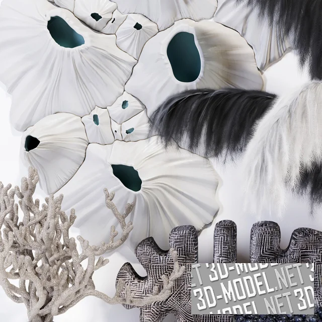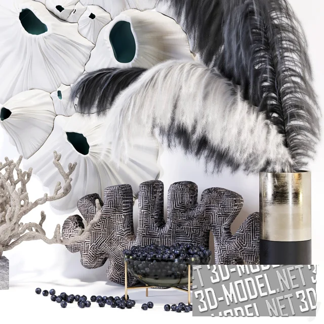 Элегантный набор интерьерного декора с черникой в стеклянном блюде, страусиными перьями в вазе, кораллом на сером каменном кубике, настольной статуэткой в виде костяка рыбы и декоративным настенным панно в виде колонии крупных раковин рачков-балянусов («морских желудей»).