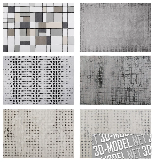 Современные прямоугольные коротковорсовые ковры от Esprit. Представлены в шести вариантах: Buttons Wool Gray Taupe, Corso Charcoal, Luna Gray, Velvet Grid Gray, Velvet Spots Beige Grey. Один с рисунком из грубых небольших прямоугольников в блеклых цветах с черными контурами по белому фону. Еще пять - рустикальные вариации оттенков серого и серо-бежевого, с «полустертыми» темными геометрическими орнаментами.