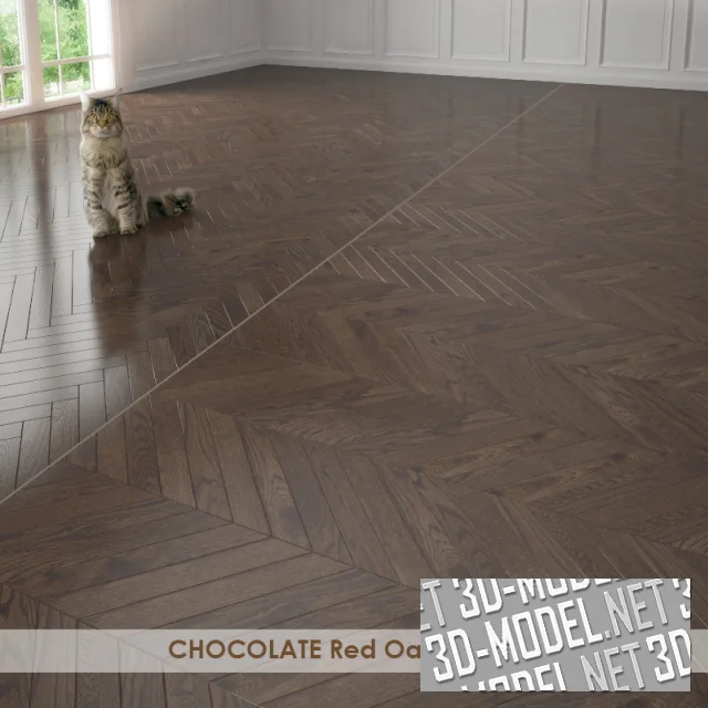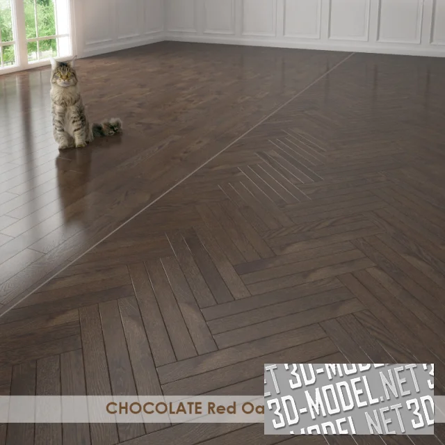 Классический деревянный паркет из красного дуба CHOCOLATE с несколькими вариантами укладки. Ламели в разных вариантах отличаются габаритом: доски (60-80смх10см), доска стандарт (80-100смх10см), «шеврон» (50х6см), «елочка» (50х6см), «твист» в две доски и «твист» в три доски (50х6см), корзинное плетение в две панели (50х6см). Дерево тонировано коричневым, сохраняя текстуру.
