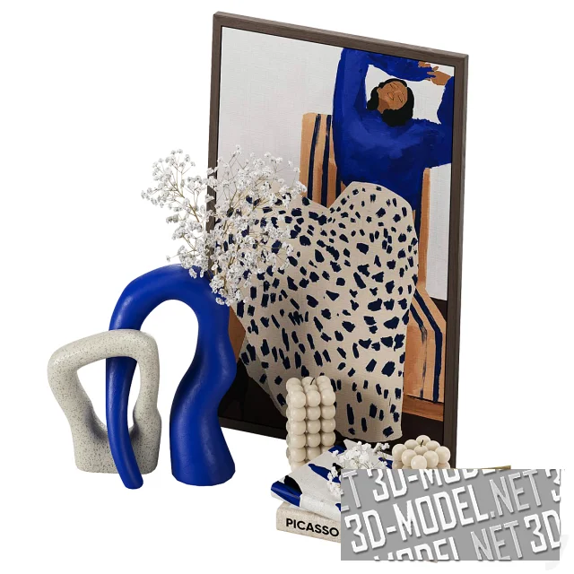 Набор декора в сочетании ультрамаринового, белого, черного и охристого цветов. В комплекте абстрактная картина с изображением девушки в ультрамариновом свитере и пятнистой белой юбке, свечи из белых парафиновых шариков, книги, абстрактные вазы с ветками гипсофилы. Габарит набора: 80х45х70см.