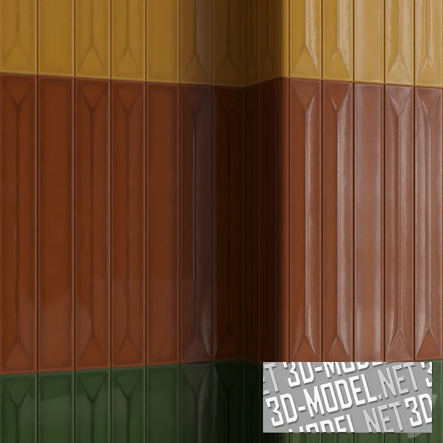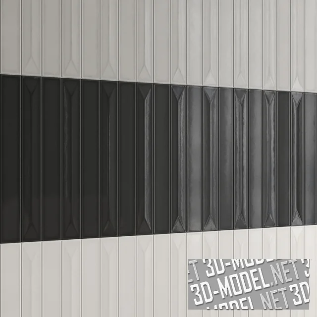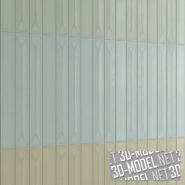 Коллекция керамической плитки Vitral от Equipe ceramicas. Представлено двенадцать спокойных цветов (снежно-белый, светло-серый, черно-серый, бледно-голубой, светло-мятный, светло-оливковый, песочный, грязно-розовый, охристый, карамельно-коричневый, лесной темно-зеленый, сине-зеленый). Плитка в виде узких вертикальных планок имеет два варианта - с гладкой, ровной поверхностью и с декором в виде небольшого рельефного четырехскатного выступа. Габарит «кирпичика» 5х40см. В сцене шесть вариантов укладки.