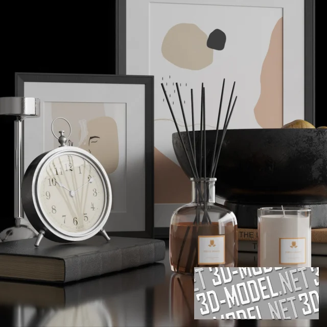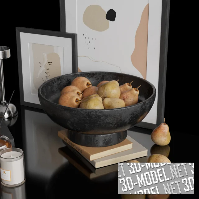 Две картинки в черных рамках, с абстрактным сюжетом в декоративном наборе. Кроме картин в наборе: круглое глубокое черное блюдо с поздними желтыми грушами, аромо-диффузор, аромо-свеча, серебристые подсвечники, настольный будильник в серебристом корпусе, книги.