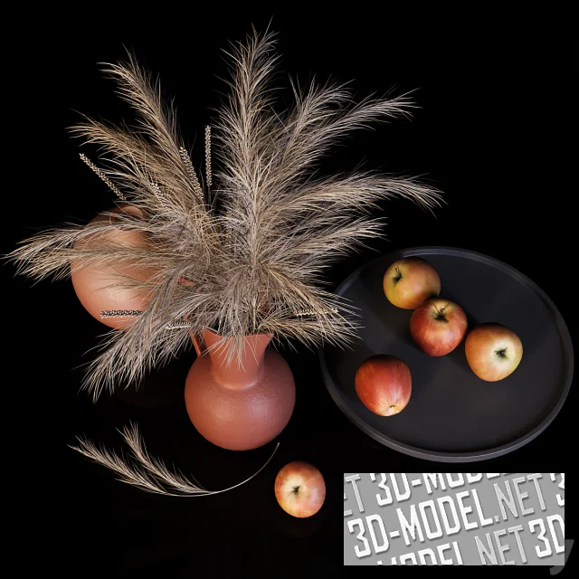 Современный интерьерный декор с красно-желтыми яблоками на круглом черном блюде, парой терракотовых ваз и репродукцией контурного женского портрета Henri Matisse с бежевым паспарту и тонкой черной рамкой. В одной из ваз сухой букет из пампасной травы.