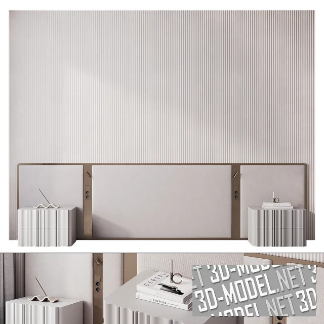 Современная композиция для интерьера спальни. Мягкое изголовье, стена с рифленой отделкой, прикроватные тумбы от KOZA HOME, розетки и выключатели – все элементы будут гармонично вплетаться в любое пространство, образуя единое целое.