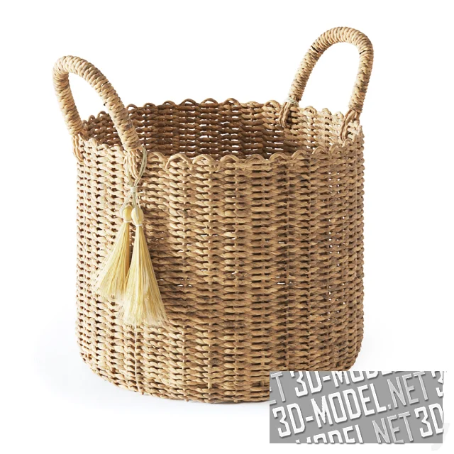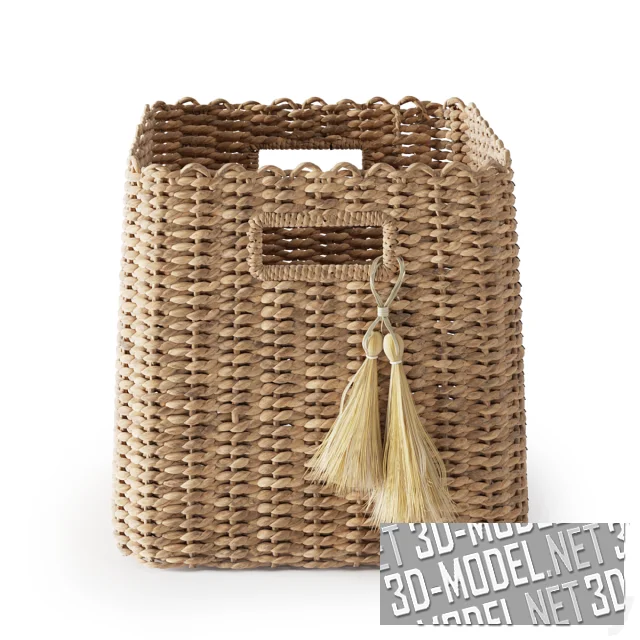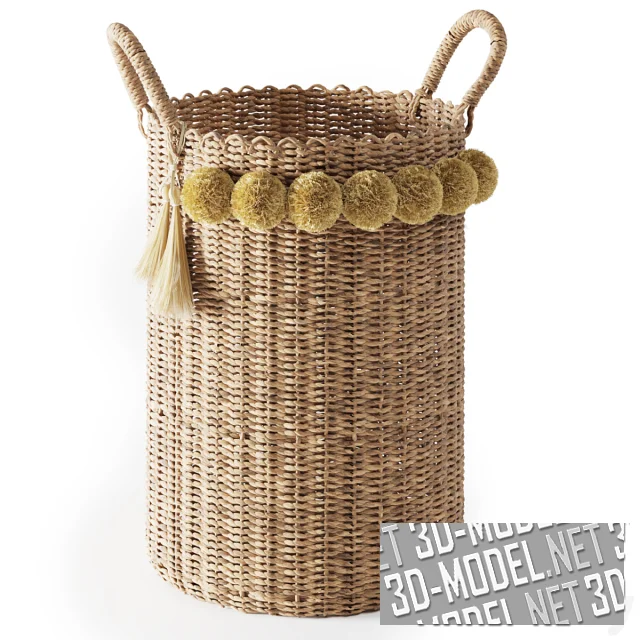 Плетеные из водяного гиацинта корзины от Serena & Lily. В наборе три варианта: прямоугольная с прорезями ручек, цилиндрическая невысокая и цилиндрическая высокая с ручками сверху. Корзины декорированы декоративными кистями и помпонами из бледно-желтого материала.