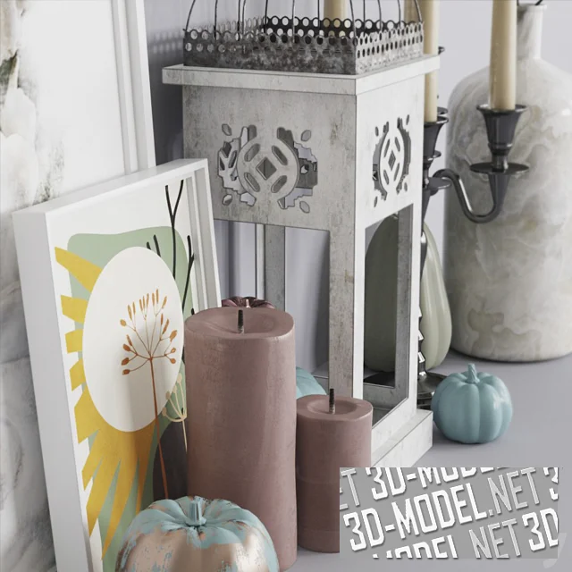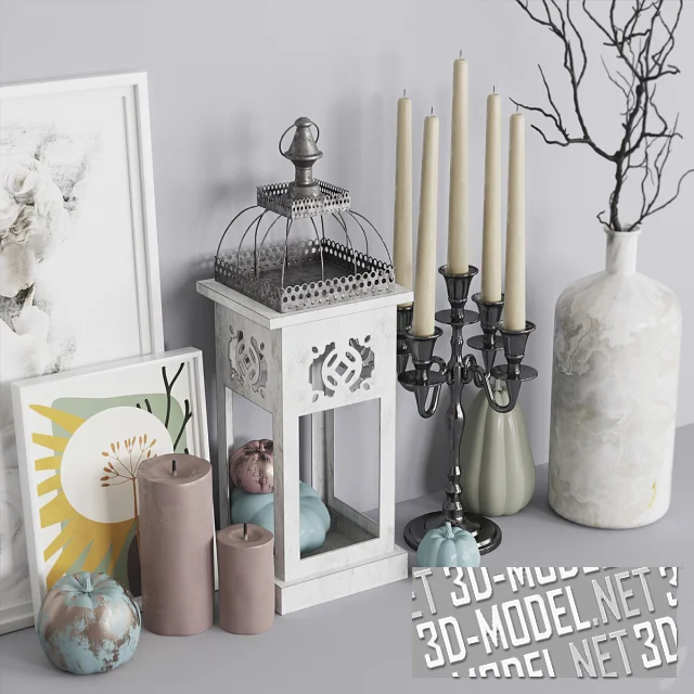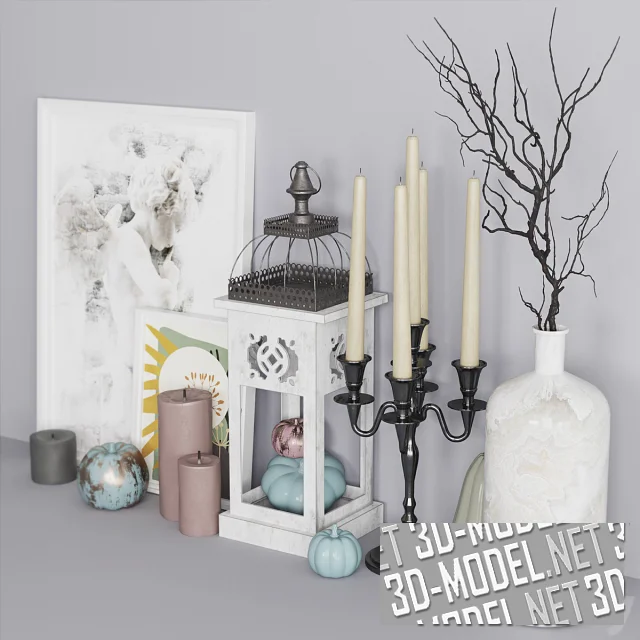 Декоративная композиция для наполнения различных интерьеров. В набор вошли ваза с сухой веткой, канделябр с пятью свечами, картины, цилиндрические свечи и бутафорские тыквы разной формы.