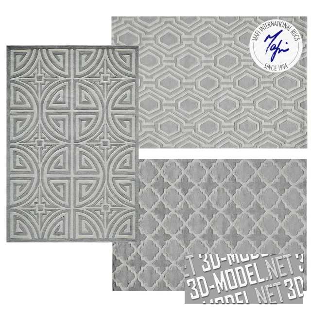 Современные коротковорсовые прямоугольные ковры с орнаментами серых тонов от Mafi international rugs. Габарит ковра: 360х560см. Орнаменты представлены в трех вариантах: в марокканском стиле, с кельтским мотивом, с паттерном из вытянутых шестиугольников.