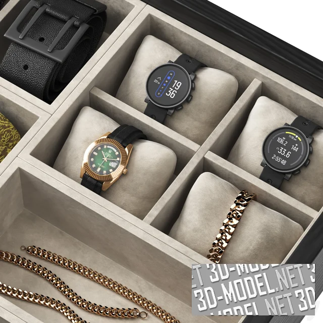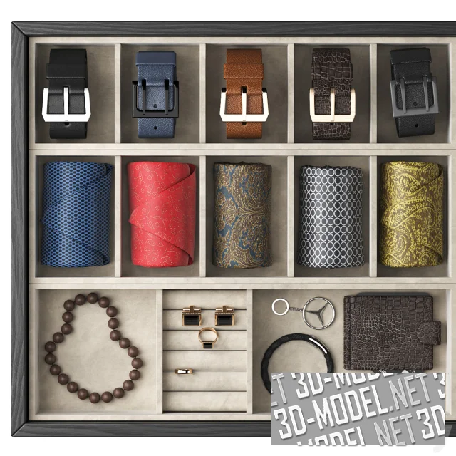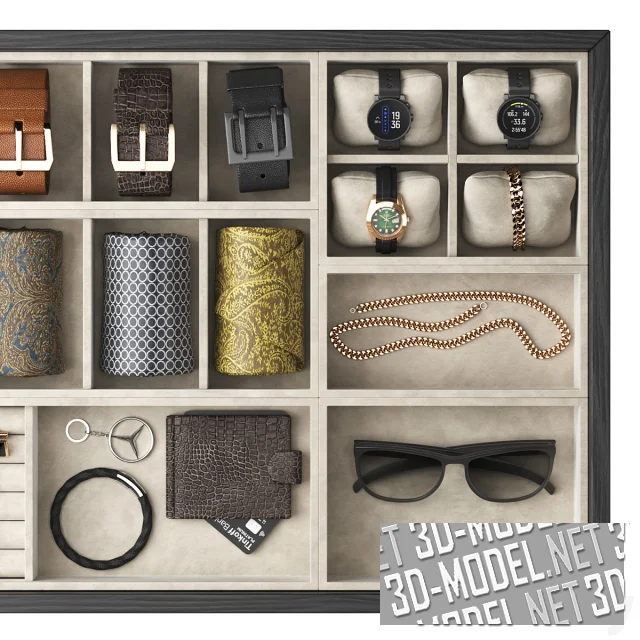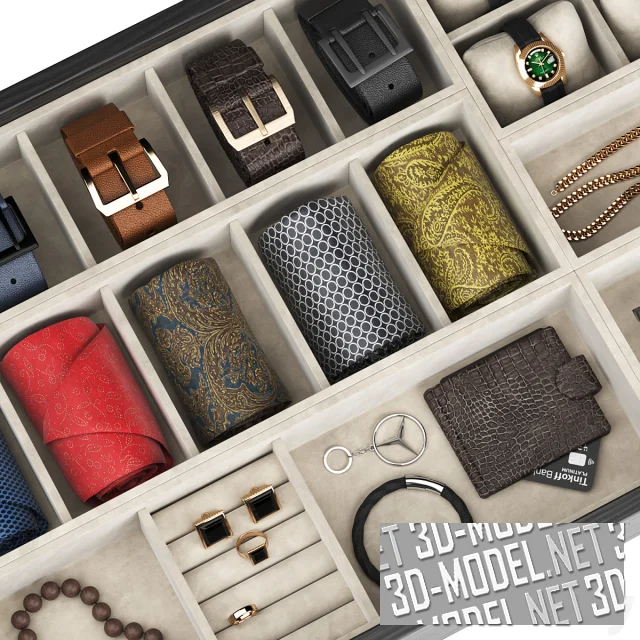 Набор современных мужских аксессуаров, помещенных в органайзер. Состоит из ремней, галстуков, часов, колец, запонок, браслетов, очков, кошельков, деревянных четок и цепочек.