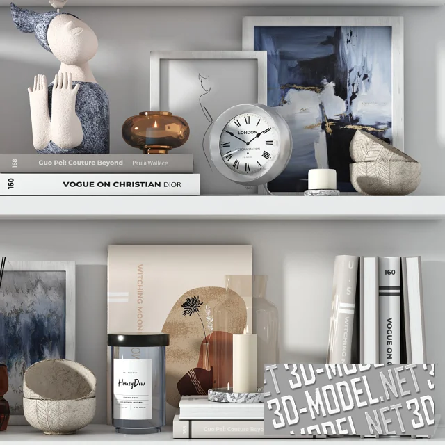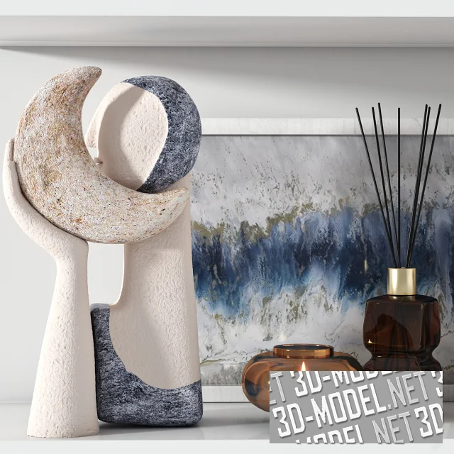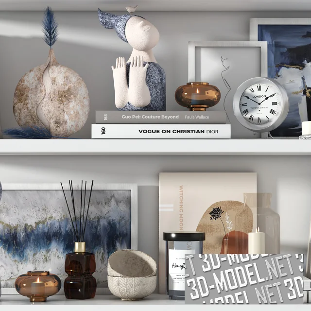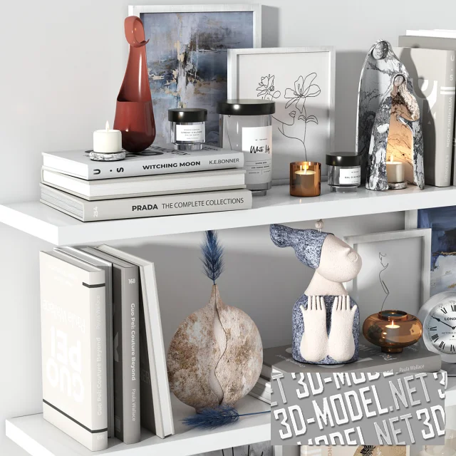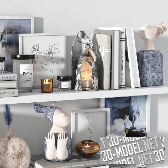 Современный интерьерный декор на белых полках с акцентами темно-синего цвета. В наборе: художественная керамика в бело-синем сочетании. Это три настольные статуэтки в стиле этно-контемпорери и рустикальная ваза с синим сухим фрагментом метелки пампасной травы, абстрактные картины в сине-бело-золотисто-черном сочетании и контурные рисунки в белых рамках, книги в белых и светло-серых обложках, аромо-диффузор с палочками в темно-коричневом с золотистой окантовкой флаконе, аромо-свечи, подсвечники из мрамора и цветного стекла, настольные круглые белые часы, рустикальные пиалы, мраморная статуэтка-подсвечник, красно-коричневая ваза в виде хищного цветка.