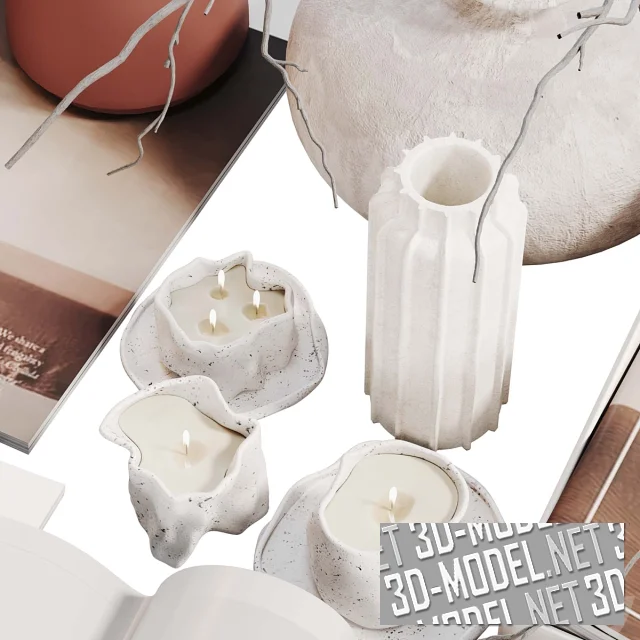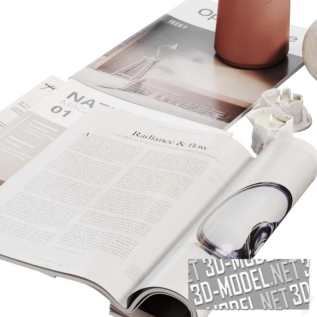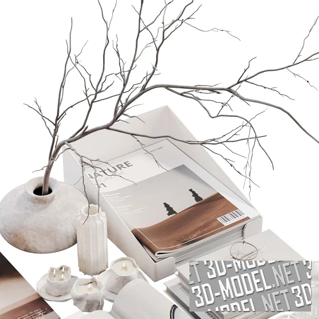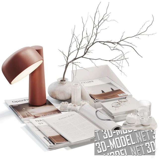 Современный набор интерьерного декора с настольным светильником в минималистичном стиле Gio Task Light. В комплекте керамическая ваза с сухой веткой, глянцевые журналы, белый каменный поднос, подсвечники со свечами, очки, стакан с водой. Настольная лампа цвета терракот, на гладкой ножке с круглым поворотным рефлектором.