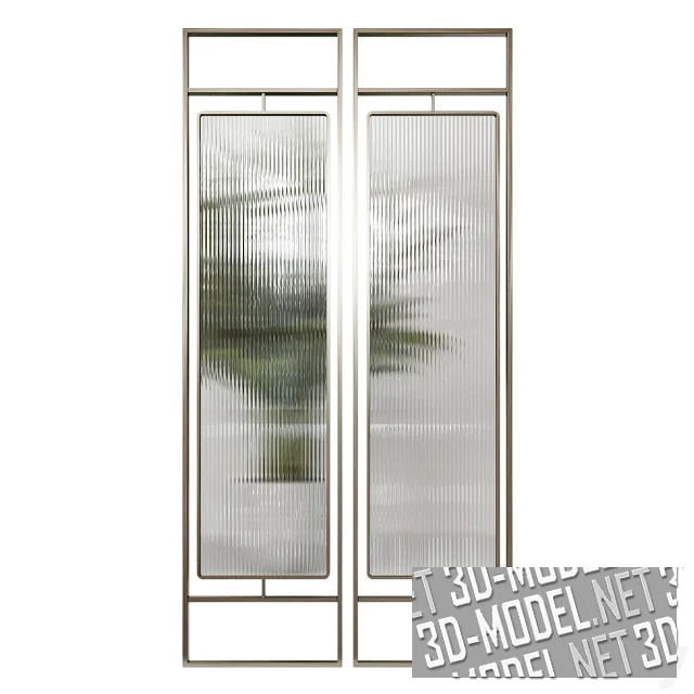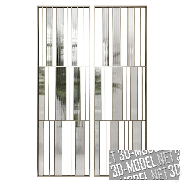 Современные разделительные декоративные перегородки из рельефного стекла и металла. Представлено пять вариаций: двойная прямоугольная трехъярусная рамка с прямоугольными асимметричными вставками из стекла; двойная вертикальная прямоугольная рамка с ножкой внизу и комбинированным рельефным стеклом (1/5 снизу - с коричневатой тонировкой и рельефными квадратиками, 4/4 - прозрачное стекло с рельефом в виде продольного вертикального гофрирования); одинарная широкая прямоугольная рамка с заполнением из коричневатого стекла с квадратиками; двойная прямоугольная рамка с прямоугольной вставкой; две скругленные вертикальные рамки на распорках с комбинированной вставкой из двух видов стекла.