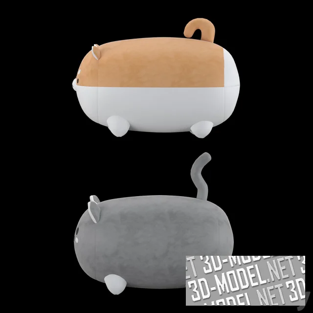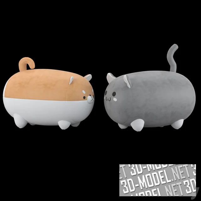 Современные мягкие игрушки-подушки в виде цилиндрических валиков, изображающих кота и пса. Кот серый, с белыми «лапками и ушками». Собака - бежевая с белым «животом», «лапами» и «ушками».
