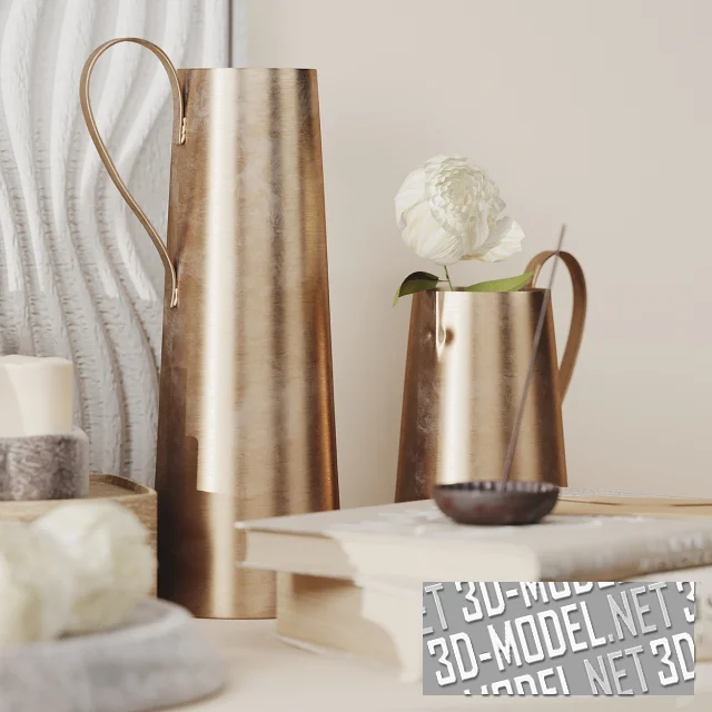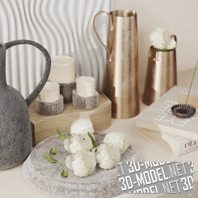 Современный интерьерный набор декора от Zara home с каменным серым кувшином с двумя ручками (26х29х29см), сланцевым подносом (d30,5/h3,5см), каменными подсвечниками (d10/h6см), двумя латунными лейками с ручками (17х12х17см), двумя книгами, конвертом и квадратным рельефным гипсовым панно в белой рамке. На каменной тарелке - бутоны белых цветов. Подсвечники в виде каменных стаканчиков с белыми свечами размещены на деревянной подставке. Кроме этого в сцене металлическая рустикальная подставка с аромо-палочкой.