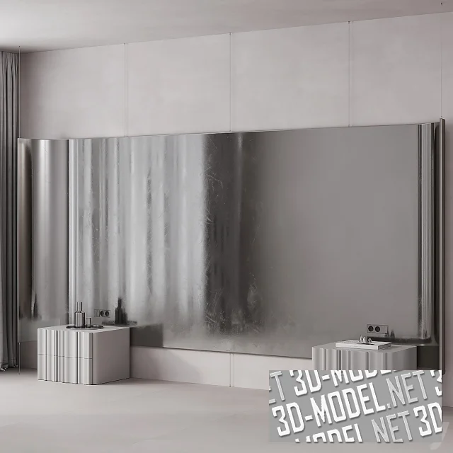 Современный комплект декора стены в изголовье кровати с большой подвесной металлизированной панелью и парой прикроватных тумб от KOZA HOME. Горизонтальная прямоугольная панель со скругленными подворотами по бокам подвешена на вертикальных тросах-растяжках. Серебристая металлизированная поверхность покрыта множеством царапин, пятен и потертостей, создавая в мутных отражениях интересные визуальные эффекты.
