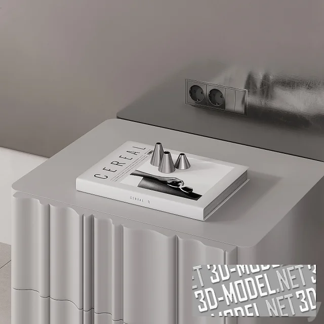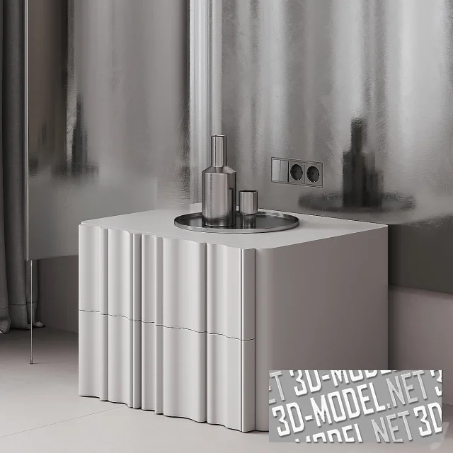 Фасады двух выдвижных ящиков белых тумб декорированы вертикальной фрезеровкой, формирующей каннелюры разной ширины. На тумбах книга, круглый металлический поднос с графином и стаканом. На панели смонтированы врезные розетки и выключатели.