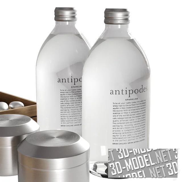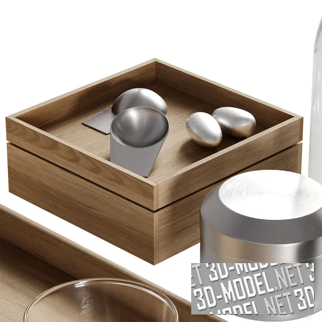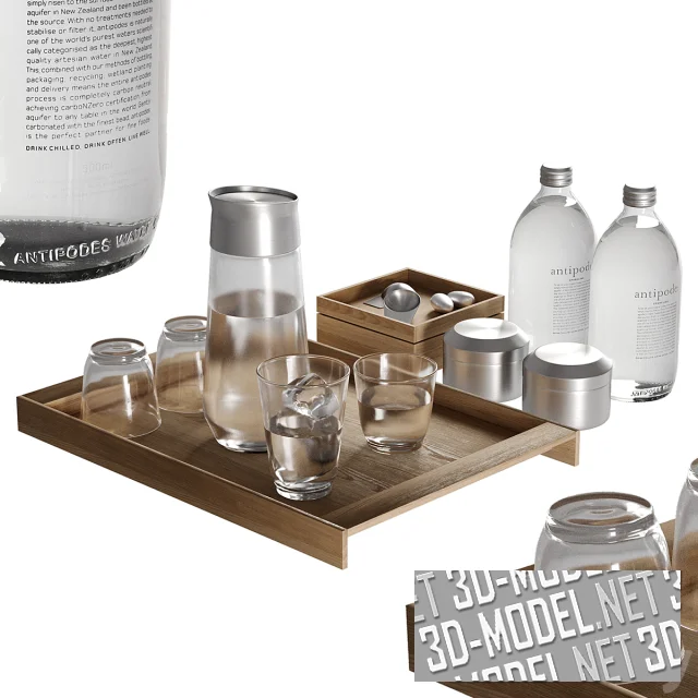 Современный интерьерный набор декора в минималистичном стиле. В комплекте прямоугольный и квадратный деревянные подносы; стаканы и графин из прозрачного стекла (в одном стакане и графине - вода, в другом стакане - вода и кубики льда); нестандартные серебристые ложечки и небольшие серебристые яйца на меньшем, квадратном подносе; пара стеклянных бутылок воды с серебристыми крышечками; пара круглых серебристых баночек.