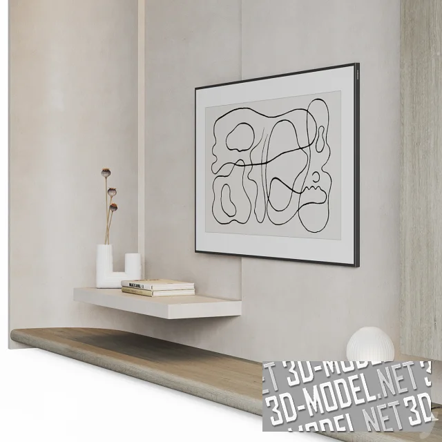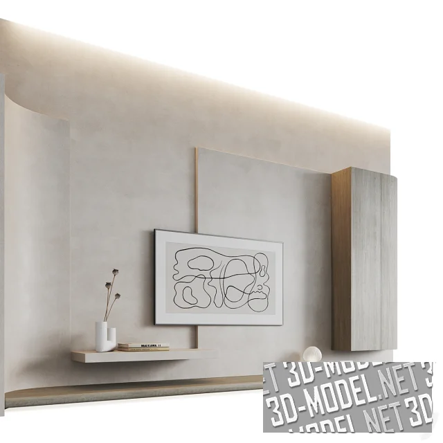 Современная ТВ-стена с длинной нижней деревянной полкой, с полкой поменьше, навесным шкафом и декором. Заставка на телевизионной панели (TV Samsung Frame 65") изображает черный контурный абстрактный рисунок с белым паспарту, прекрасно сочетающийся с общим интерьером в цветах слоновой кости и светлого натурального дуба (длинная полка и навесной шкаф). Шкаф имеет две створки - прямую левую и изогнутую правую. Гипсокартонная стена за телевизионной панелью имеет небольшую нишу (в ее нижней части и находится короткая полка) и скругленный подворот. На полках: настольная лампа Chanya от La redoute, книги, двойная белая ваза с сухими головками мака.
