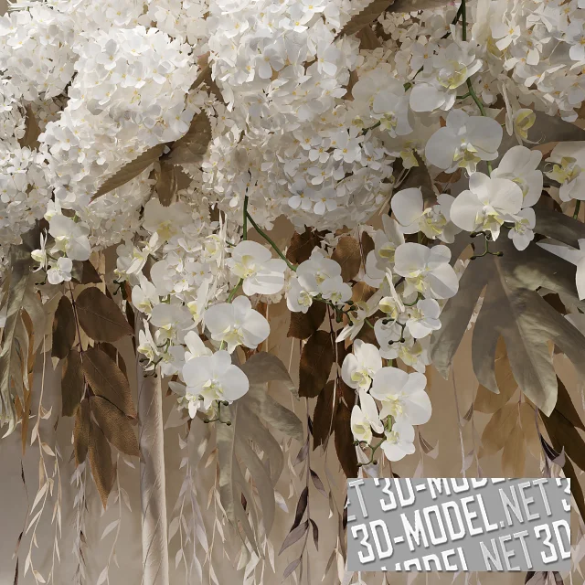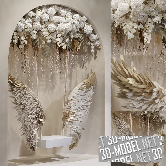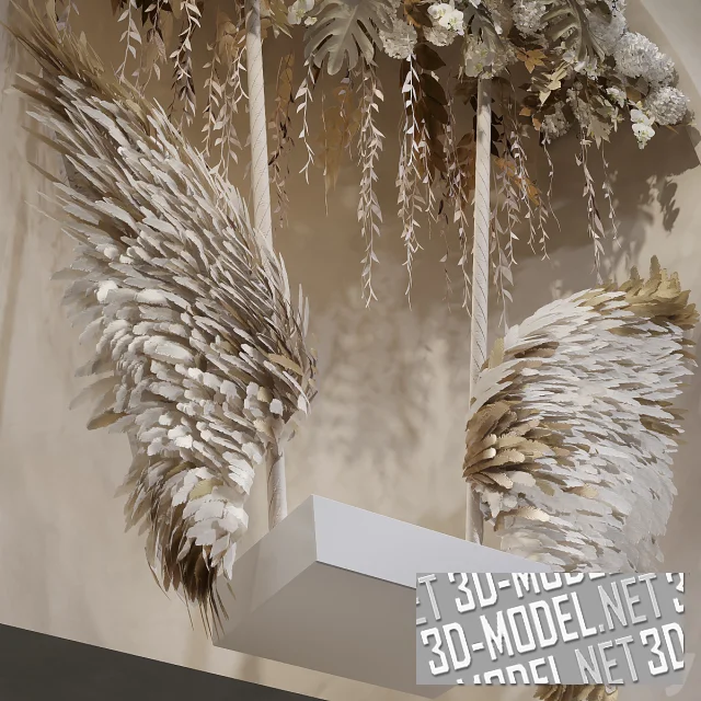 Декоративная современная фотозона в романтическом стиле с качелями, крыльями и цветами. Композиция выстроена в арочной нише. Белое сиденье качелей подвешено на двух толстых канатах к верхней части арки, задрапированной множеством белых орхидей, гортензий, сухих листьев монстеры и свисающих сухих ампельных растений с мелкими тонкими листиками. К сиденью прикреплены раскрытые декоративные крылья с белыми искусственными перьями. Крылья гармонично добавляются к образу присевшего на качели.