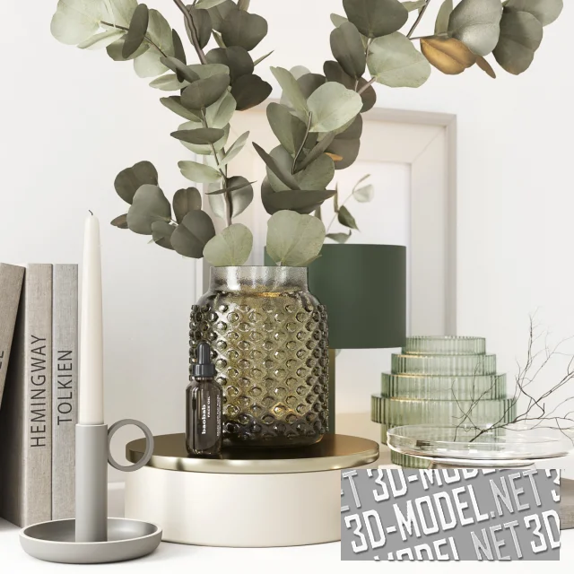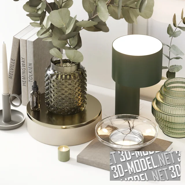 Набор интерьерного декора в современном стиле с бледно-зелеными элементами. В сете ветки эвкалипта в вазе из тонированного коричневато-зеленого стекла, декорированного выпуклыми «каплями», круглая белая шкатулка с золотистой крышкой, книги в светло-серых обложках, белая свеча на светло-сером подсвечнике, настольный минималистичный светильник темно-зеленого цвета, стеклянная ваза для фруктов с тонкой сухой веточкой, картина с изображением ветки эвкалипта в белой фотораме, аромо-свеча в бледно-зеленом стакане, ваза из зеленоватого рельефного стекла.