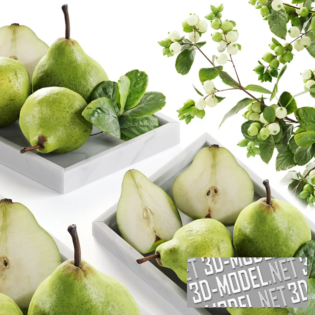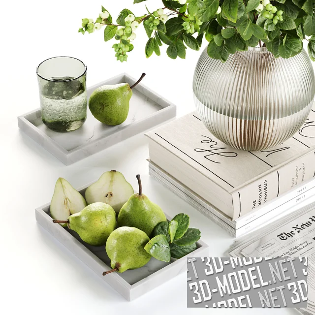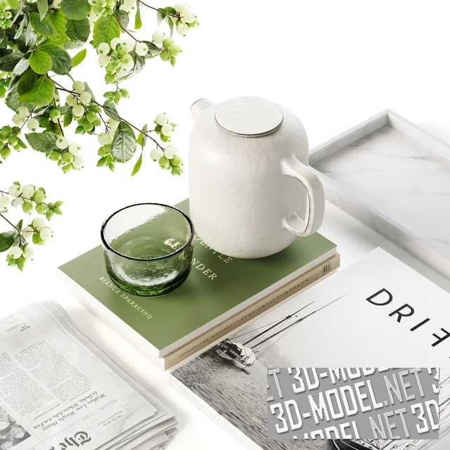 Эстетичный набор настольного декора в бело-зеленых тонах. В комплекте шарообразная ваза из гофрированного стекла с букетом из зеленых веток снежноягодника с зелеными листьями и белыми ягодами, книги в обложках белого и травянисто-зеленого цветов, газета, пара прямоугольных небольших подносов из белого с серыми прожилками мрамора, зеленые груши, стильный белый заварный чайник, стакан и пиала из зеленоватого стекла.