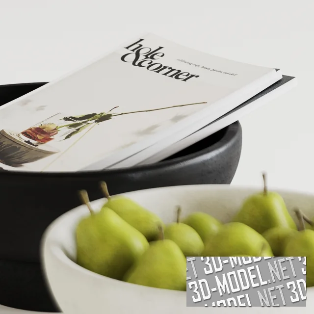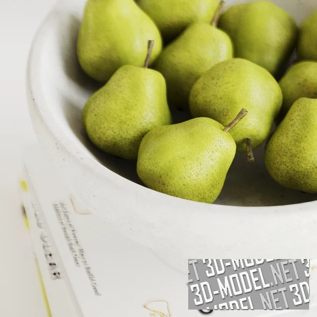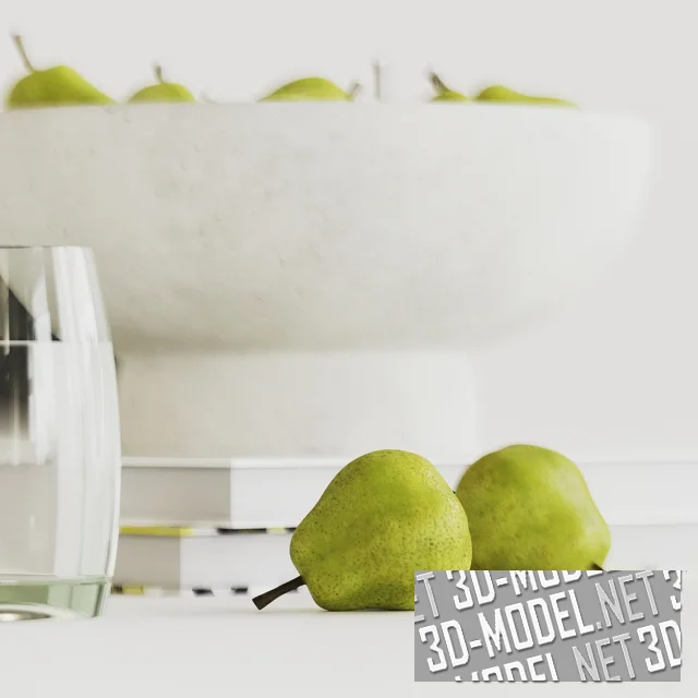 Современный интерьерный декор с зелеными грушами. Груши лежат в крупной толстостенной вазе из светлого искусственного камня. Вторая ваза из черного материала стоит рядом. Две груши лежат отдельно. Кроме этого в наборе присутствует пара книг, глянцевые журналы, бутылка с водой и стаканы из прозрачного стекла.