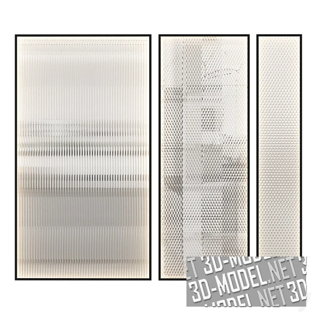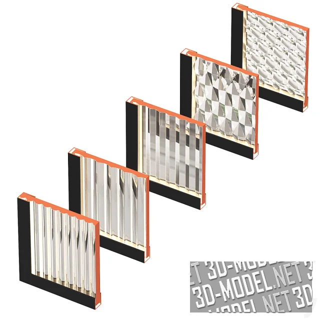 Современные перегородки из светлого ребристого стекла с подсветкой. Файл содержит 5 вариантов ребристого стекла, каждый из которых представлен в 3 размерах: 500 x 20 x 2700 мм, 1000 x 20 x 2700 мм, 1500 x 20 x 2700 мм.