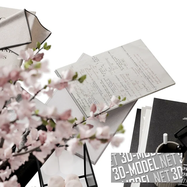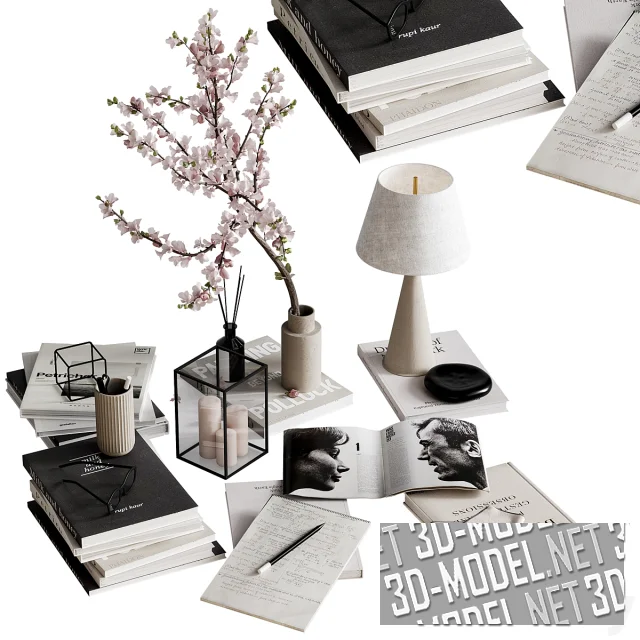 Настольный набор интерьерного современного декора с белой настольной лампой и цветущей розовой веткой в керамической вазе. Кроме этого в сете присутствуют аромо-диффузор, черные тонкие каркасы со стеклом, в одном из них размещены три бледно-розовые свечи. Книги, журналы, тетрадь, карандаш, очки в черной оправе, стаканчик с ручками, черная скругленная подставка для мелких ювелирных изделий, салфетка.