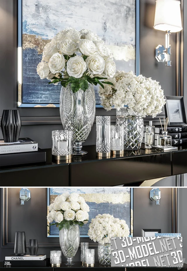 Современный элегантный набор декора и аксессуаров в стиле арт-деко, с хрустальными вазами. Симметричная композиция выстроена относительно консольного черного стола на Х-образной золотистой опоре с прямоугольной площадкой. На стене висит абстрактная картина в бледно-синих и золотистых тонах, справа и слева от картины классические бра с белыми тканевыми абажурами. На консоли книги, две черные вазы, две хрустальные вазы с белыми цветами, хрустальные стаканы, фоторамки с черно-белыми фото, аромо-диффузоры.
