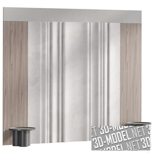 Фрагмент отделки стены в современной спальне с зоной для изголовья кровати и приставными круглыми столами темно-серого цвета. Стена отделана декоративными вертикальными панелями двух видов. По краям это прямоугольные плоские панели с текстурой светлого дерева. Между ними - симметричная рельефная вставка из белого мрамора, напоминающая складки ткани или бумаги. Венчает декор стены горизонтальная белая панель с мелкими фрезерованными вертикальными канавками.