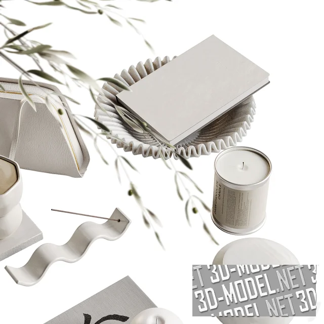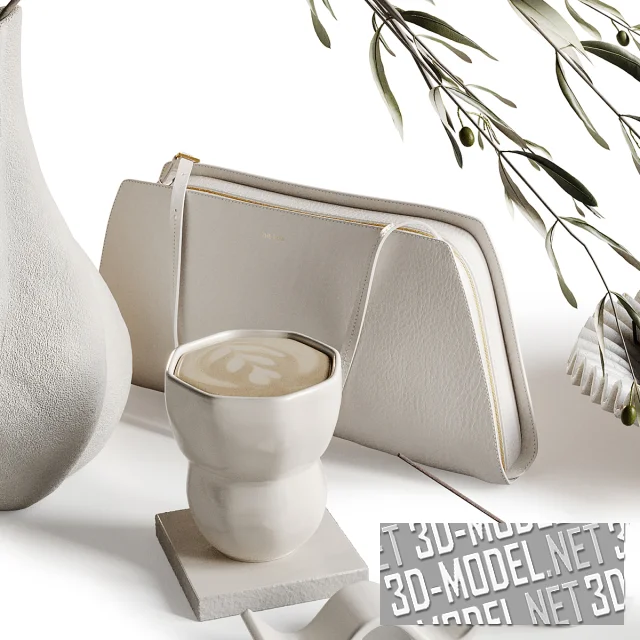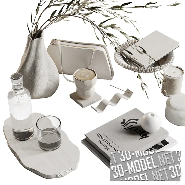 Элегантный декоративный набор в бежевых тонах. В набор входит: ваза с тонкими ветками, сумка, каменный поднос неправильной формы с бутылкой и стаканом, вазы. Дополняет сет подсвечник и книга "Neutra" Barbara Lamprecht.
