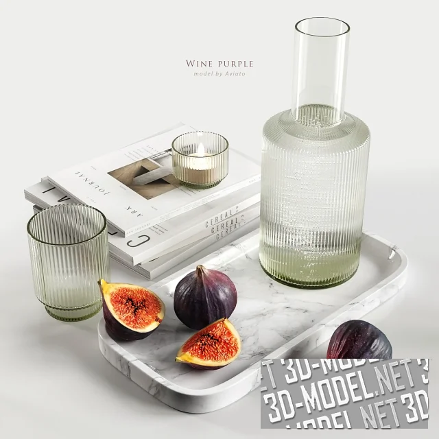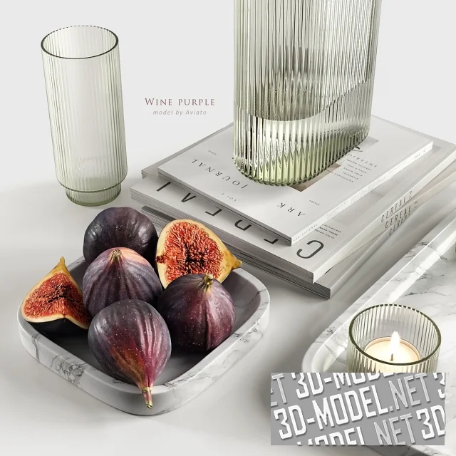 Изысканный комплект для придания интерьеру декоративности и реализма. Акцентом композиции служат соцветия гортензии и инжир. Остальные предметы посуды и декора, выполненные в светлых тонах и таких материалах, как стекло и мрамор, создают ненавязчивый контраст.