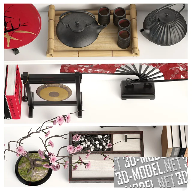 Для ценителей тонких нюансов восточной культуры в интерьере хорошей находкой станет этот сет. На белых полках представлено множество элементов для создания декораций в японском стиле. Это посуда с традиционной росписью, веер, статуэтки, книги.
