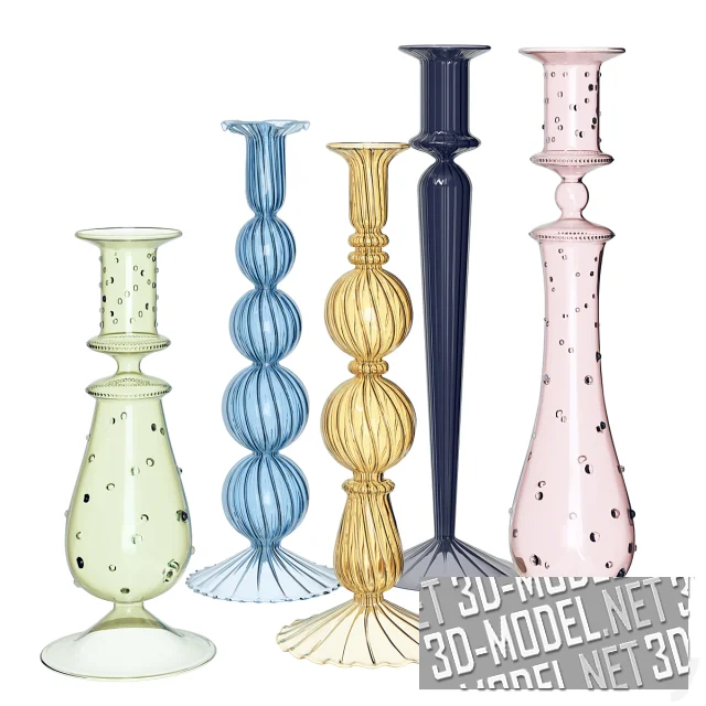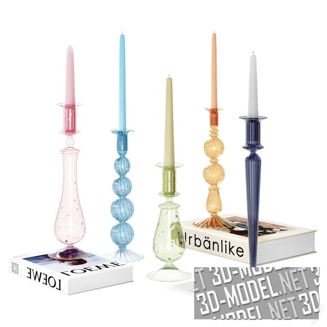 Декоративный набор с цветными свечами, книгами и флаером. Предложено пять вариантов стеклянных подсвечников. У каждого своя форма, цвет и размер.