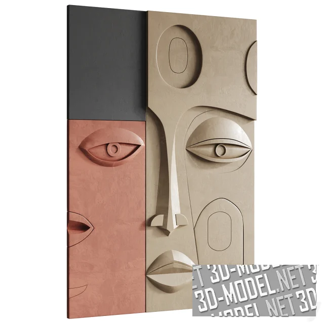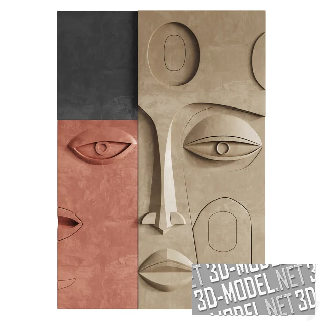 Декоративное скульптурное трехмерное панно с изображением стилизованных лиц в стиле контемпорери. Панно состоит из трех сгруппированных в одну фигуру прямоугольников графитово-черного, терракотового и песочного цветов с разводами. На терракотовой и песочной пластине - крупные абстрактные рельефные глаза, нос, рты.