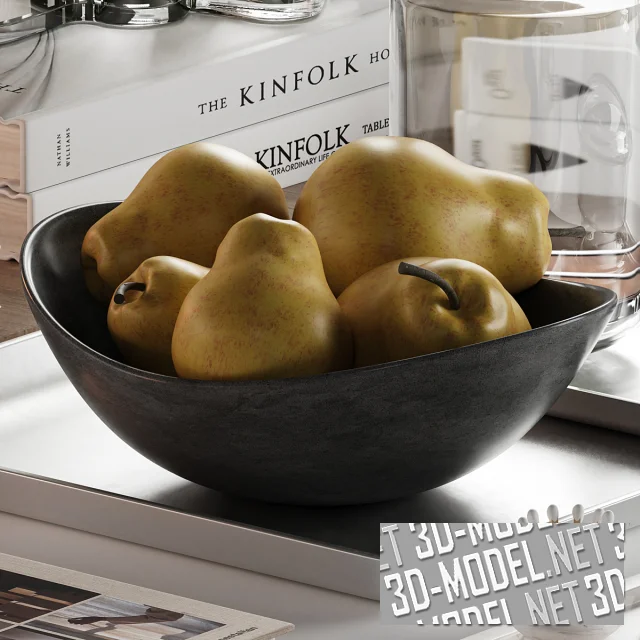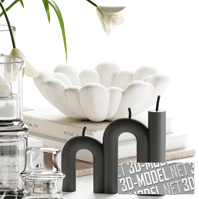 Комплект декоративных элементов, которые подойдут для украшения журнального или туалетного стола, прикроватной тумбы, праздничной сервировки и пр. Центром композиции выступает букет белых тюльпанов. В наборе светильники, свечи, вазы, книги, а также миска с грушами.