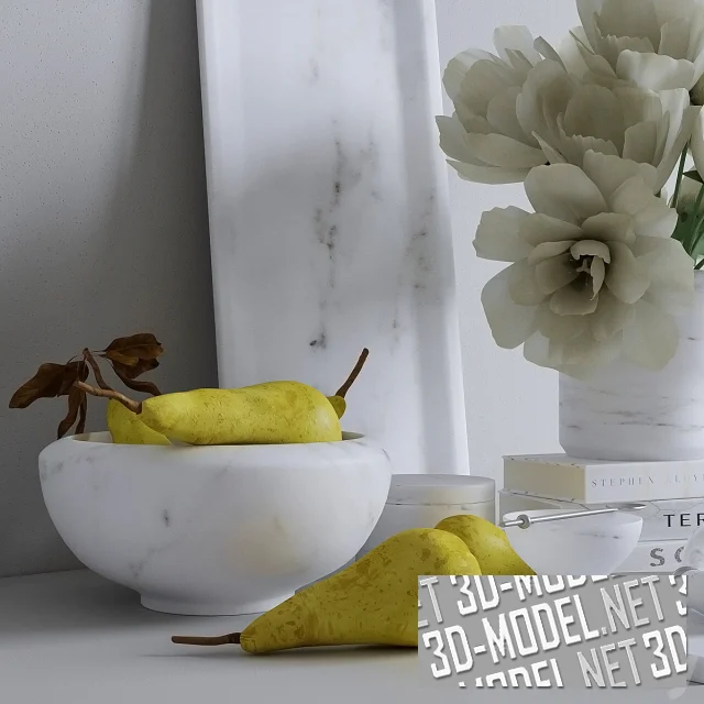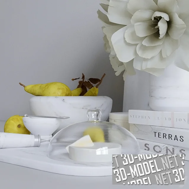 Элегантный набор для интерьера кухни или столовой. Изысканный дизайн создан благодаря посуде из белого мрамора, которая смотрится монолитно и утонченно одновременно. В комплекте сыровница с бри внутри, доска и ложка, фруктовница с желтыми грушами, банка для специй, солонка. Сет украшает ваза с тюльпанами и книги в белых обложках.