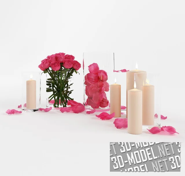 Этот декоративный набор создает атмосферу уюта и романтики, сочетая нежность роз и мягкое свечение свечей. В прозрачных стеклянных вазах расположены яркие розовые розы и лепестки, аккуратно дополненные крупными цилиндрическими свечами в подсвечниках. Свободно рассыпанные лепестки на белой поверхности придают композиции естественность и воздушность. Такое оформление выглядит элегантно и гармонично, подчеркивая праздничное или интимное настроение.