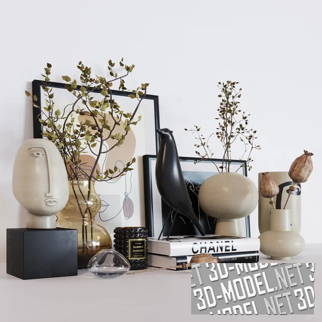 Набор декоративных аксессуаров от бренда H&M home. Скульптура птицы VITRA EAMES HOUSE и головы с половиной лица, книги Chanel и Dior, постеры в рамках и принты, зеленый букет в вазе – все вместе образует гармоничную композицию для украшения интерьера.